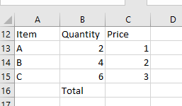 - In C16 enter =sum(B13:B15*C13:C15) as a normal function