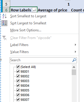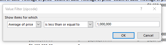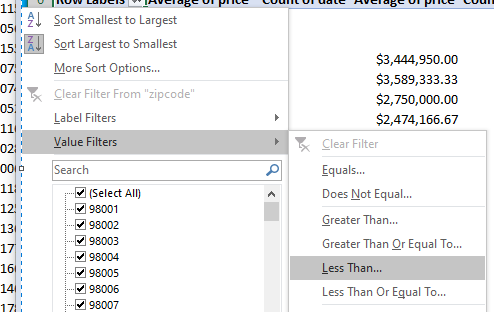 - I want to filter the values in the tables (as opposed to the zip codes) so select Value Filters and Less Than...