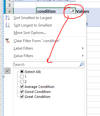 - Use the filter dropdown on Condition to select only houses in condition 3-5
